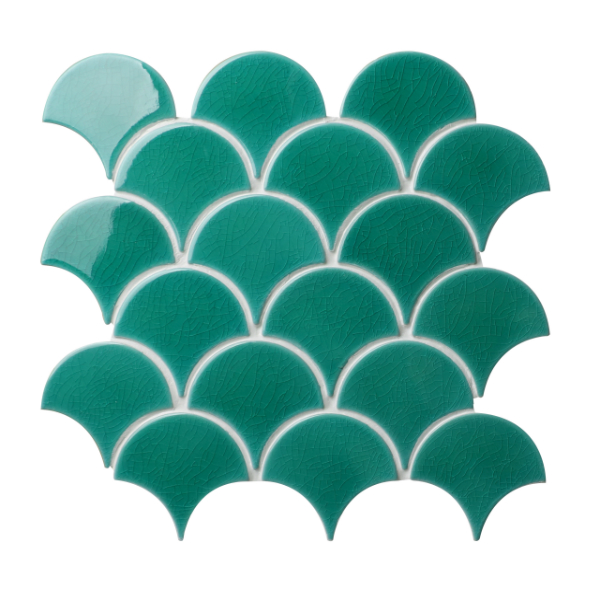 Swimming their way into bathroom and kitchen interiors, these scallop porcelain mosaic tiles will add drama to any design scheme. The mosaic tiles are inspired by the coast with a bright blue and vivid green colour palette. The crackle glaze adds a beautiful iridescent finish to these fish scale shaped tiles.