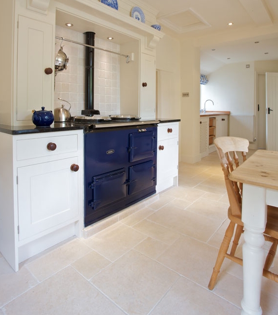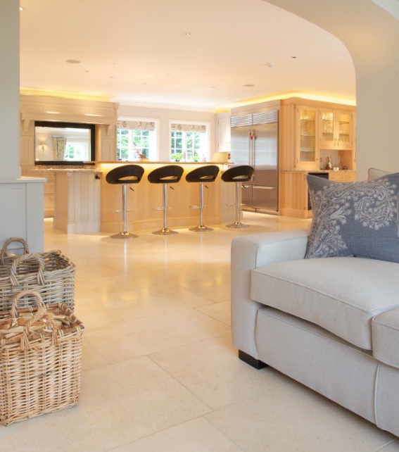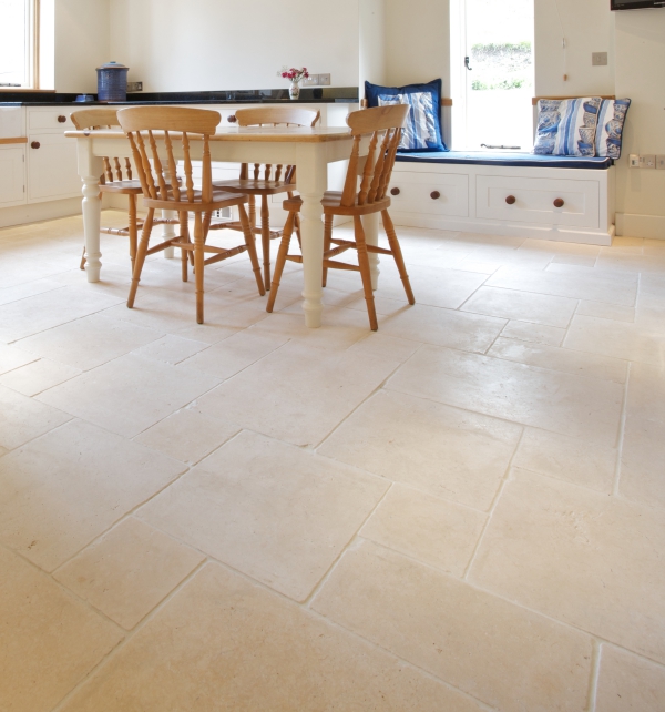 This hard, durable limestone has scattered fossil and vein markings. It is available in extra large formats. The tumbled finish exposes the surface grain and softly rounds the edges.