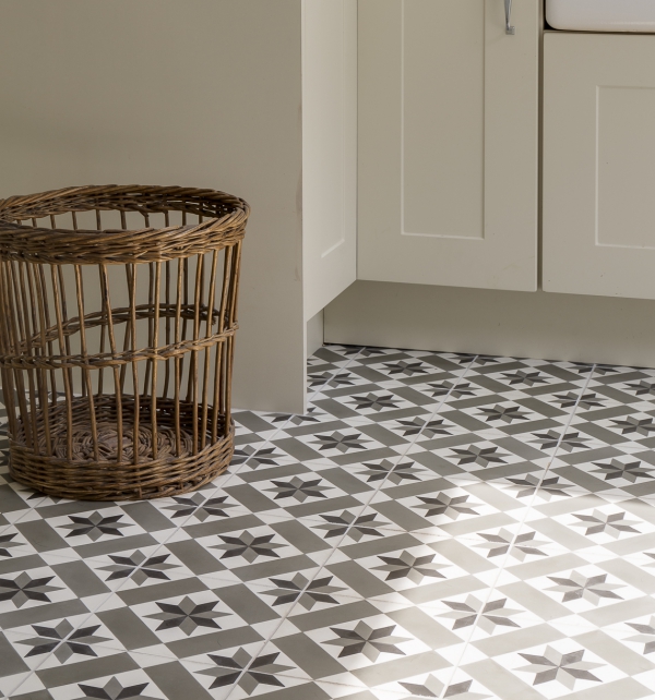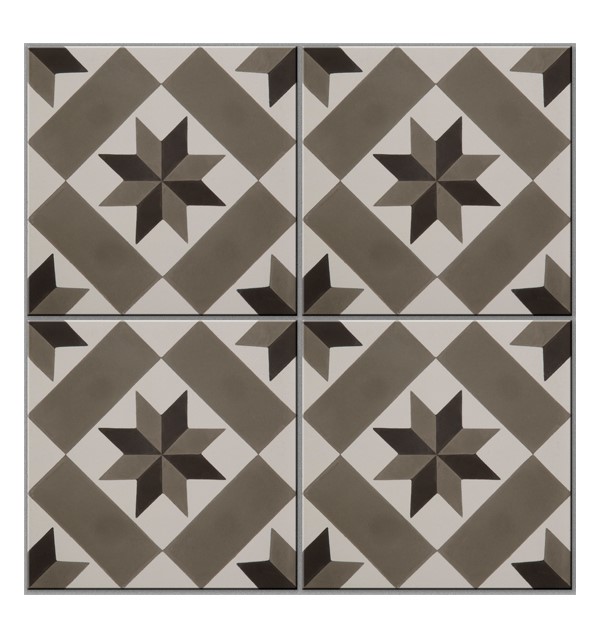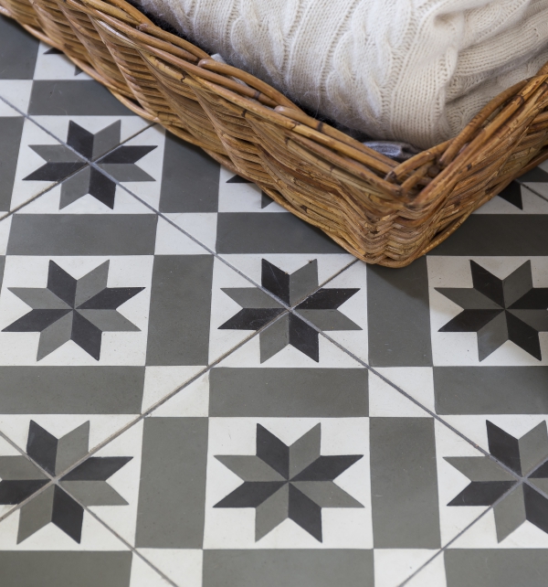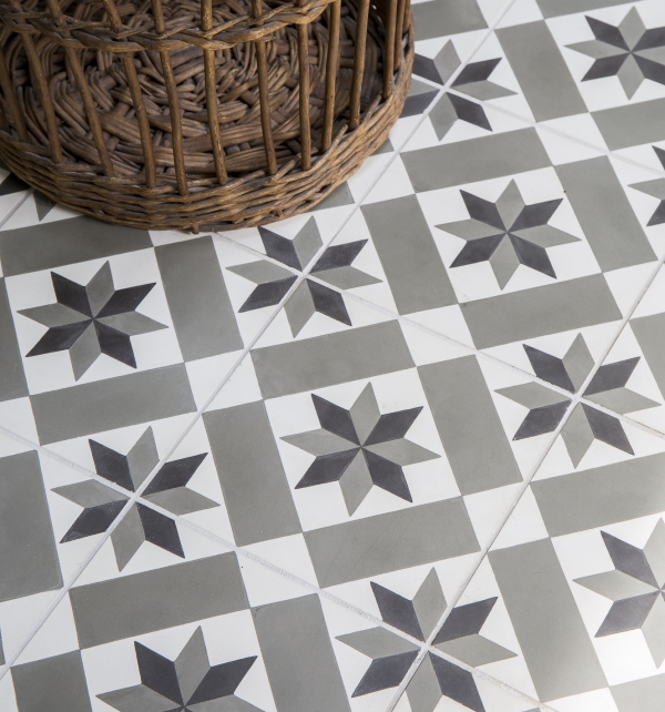 Chelsea is a graphic modern design, using two-toned grey and black stars. This show stopping pattern looks particularly effective with a charcoal field tile border.