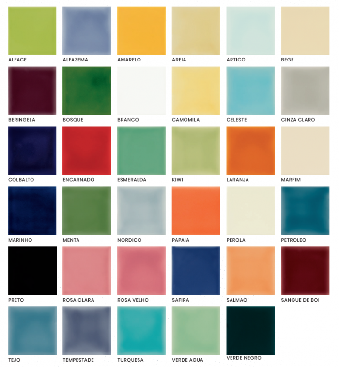 Colour: Verde Negro, Verde Agua, Turquesa, Tejo, Tempestade, Sangue de Boi, Salmao, Safira, Rosa Velho, Rosa Clara, Petroleo, Preto, Perola, Nordico, Papaia, Menta, Marinho, Laranja, Marfim, Kiwi, Esmeralda, Encarnado, Colbalto, Cinza Claro, Celeste, Branco, Camomila, Bosque, Beringela, Bege, Areia, Artico, Amarelo, Alfazema, Alface