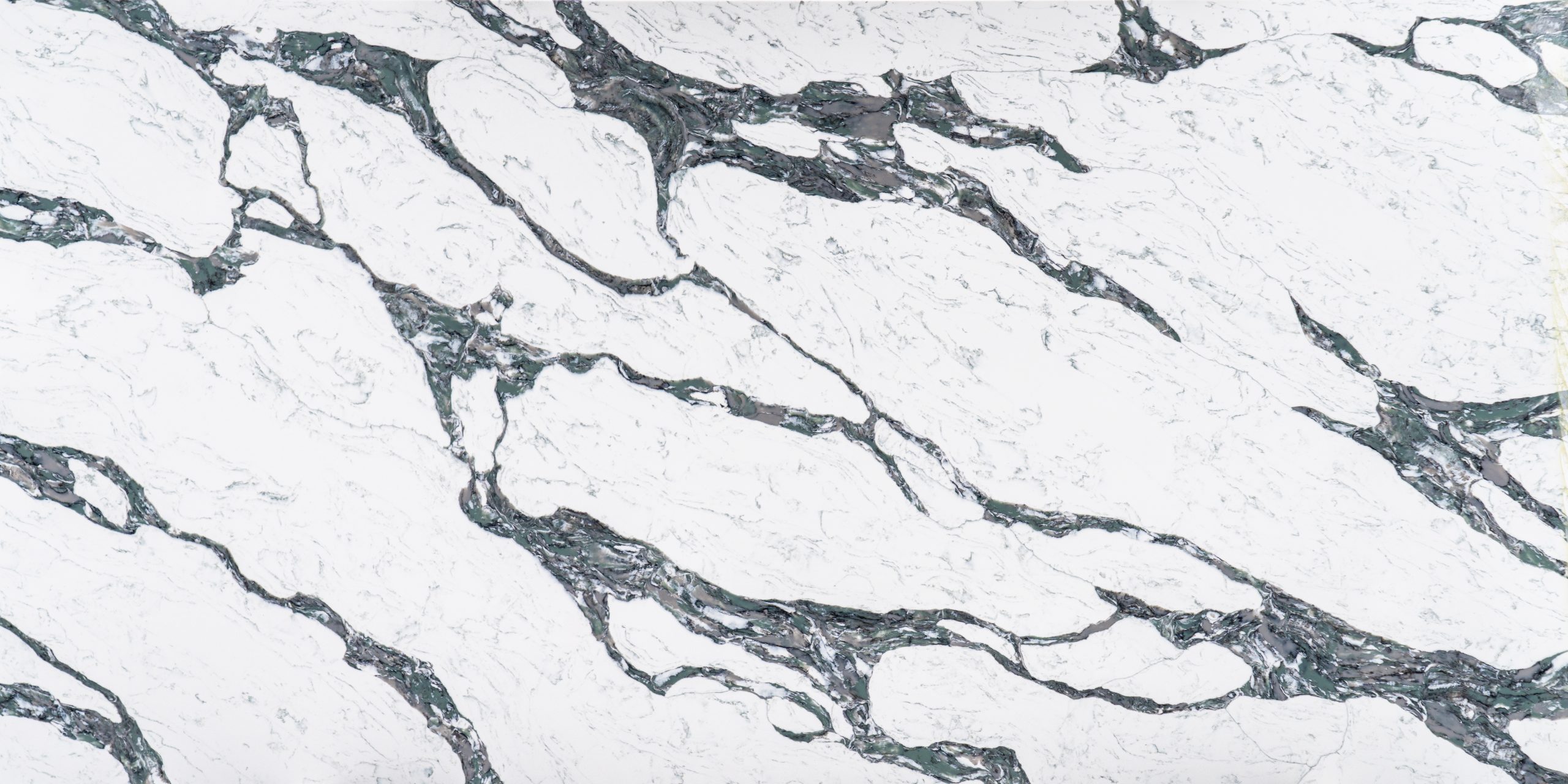 Fantasy Verde Quartz is characterised by a crisp white background intersected by dramatic, flowing veining in deep green and charcoal tones. The bold, organic pattern creates striking movement across the surface, delivering a strong visual statement inspired by expressive natural stone. This distinctive design makes Fantasy Verde an ideal choice for feature kitchen worktops, statement islands, contemporary bathrooms and impactful feature walls.