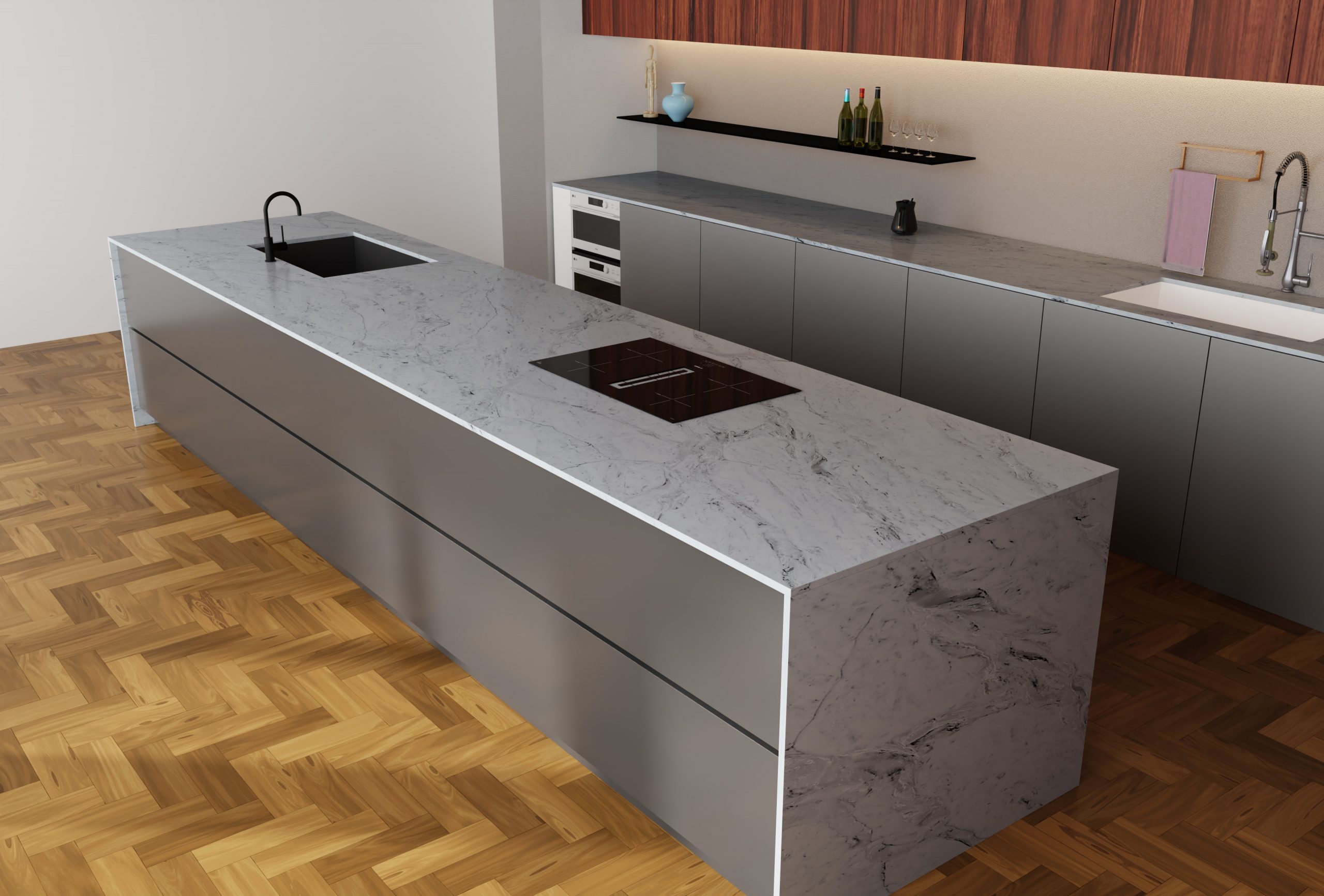 Montebello Quartz offers a soft, light-toned base complemented by flowing grey veining that moves naturally across the surface. The layered patterning delivers a refined sense of depth and texture, capturing the understated elegance of natural stone while maintaining a clean, contemporary aesthetic. Its subtle character makes it a versatile choice for modern kitchen worktops, elegant bathroom interiors and tasteful feature walls.