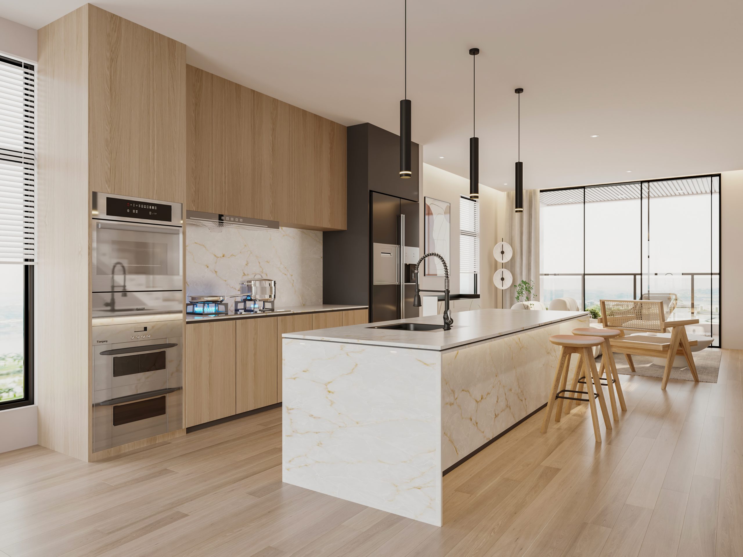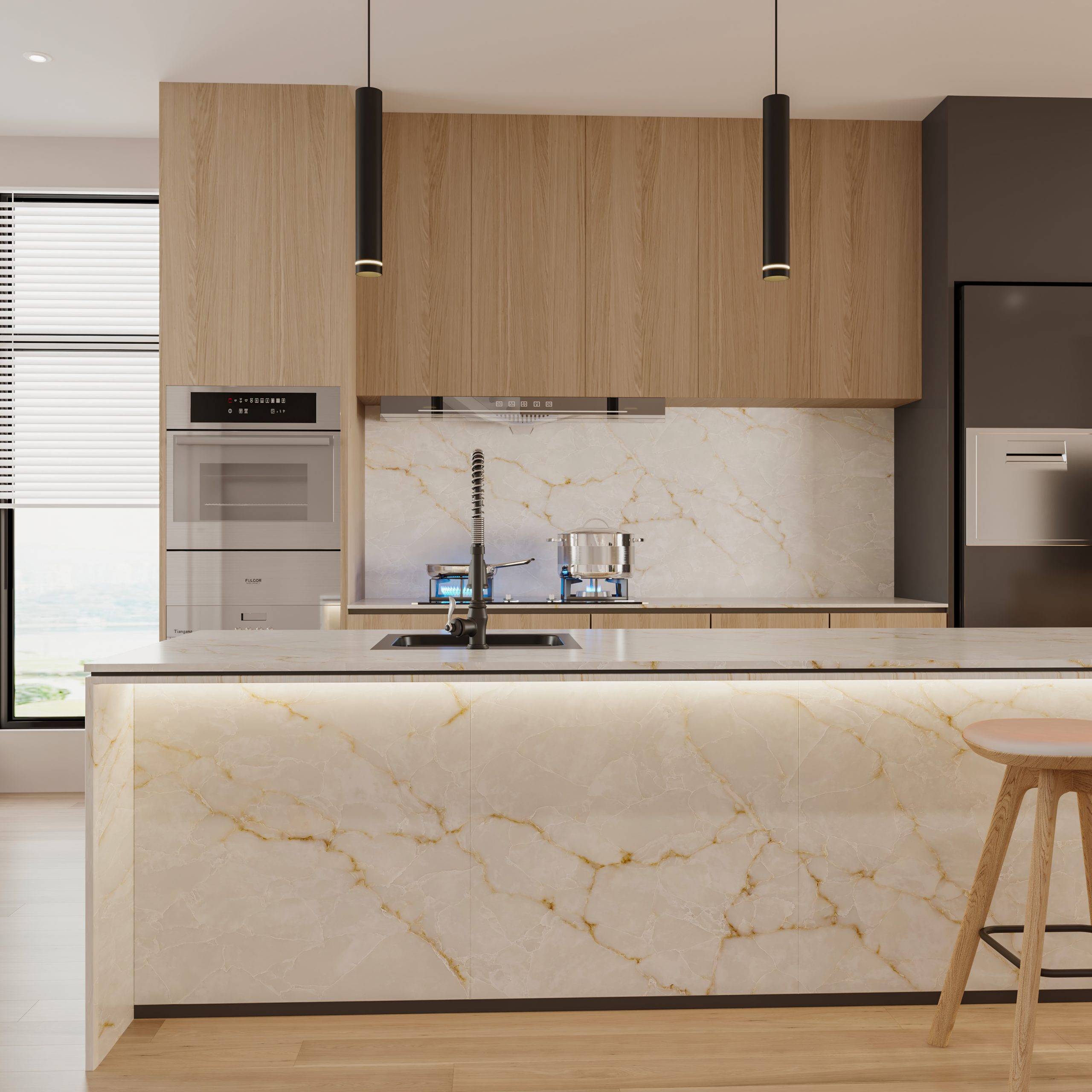 Designed to meet the demands of everyday living, Tornado Oro Quartz offers more than just aesthetic appeal. Its non-porous, hard-wearing surface is highly resistant to stains, scratches and moisture, providing a low-maintenance solution that retains its beauty even in high-use environments.