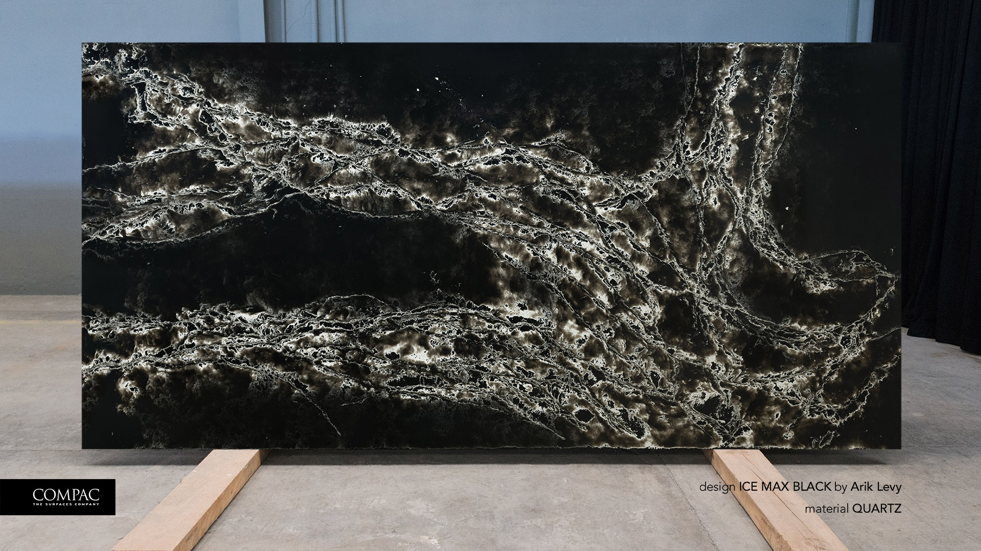 Compac’s Ice Max Black quartz is a striking choice for kitchen worktops, offering a polished black surface with delicate white veins that create a natural, yet refined look. This material, enhanced by its glossy finish, beautifully reflects light, highlighting the embedded colors and pigments. Part of the Genesis Collection, Ice Max Black is designed for maximum drama and effect, making it an ideal selection for those seeking a bold and sophisticated addition to their kitchen. It combines the durability and low maintenance of quartz, ensuring that this luxurious surface remains a practical choice for everyday use.