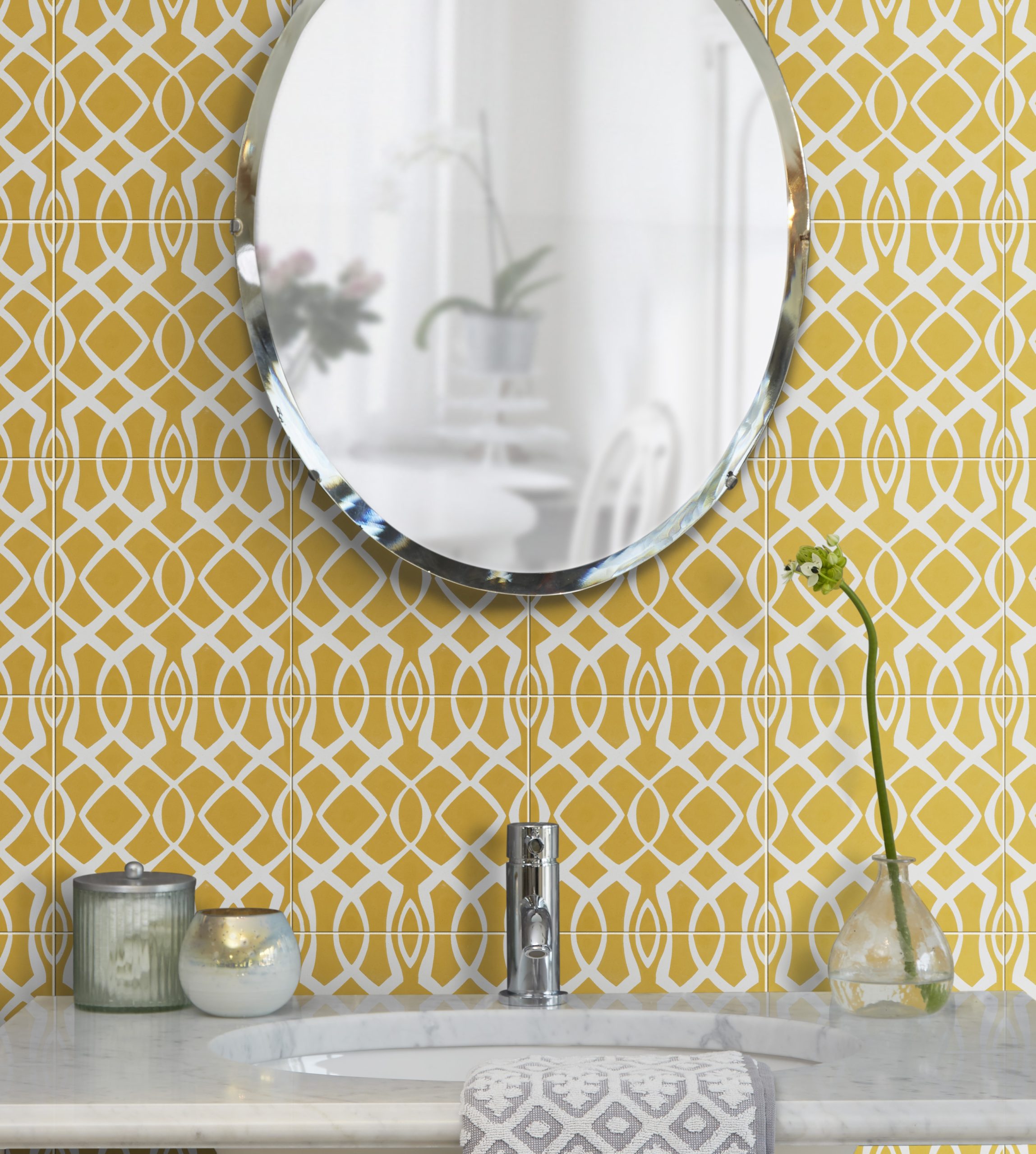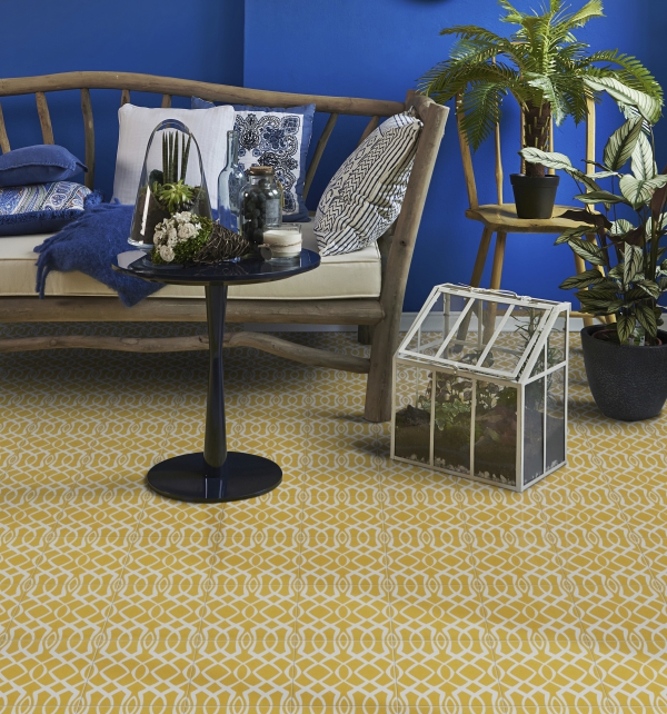 Modern Lattice features an intricate trellis pattern set against a colourful background. There are three colours to choose from, a vibrant yellow, Moroccan blue and a subtle pale grey.
