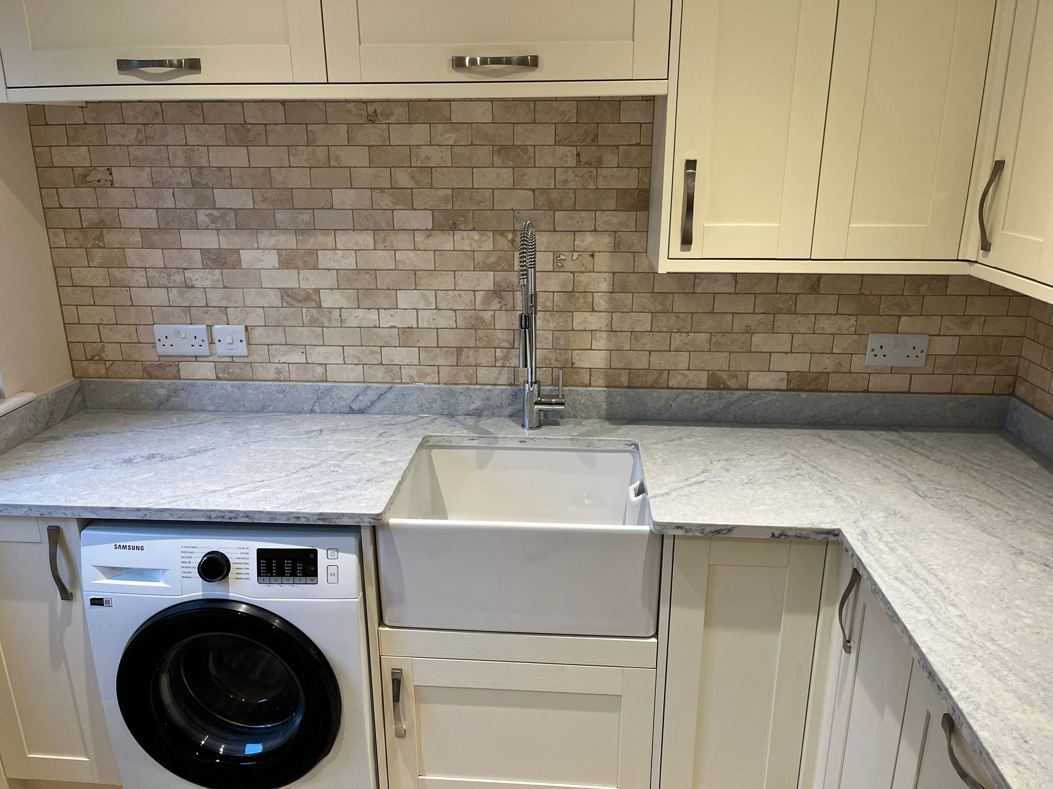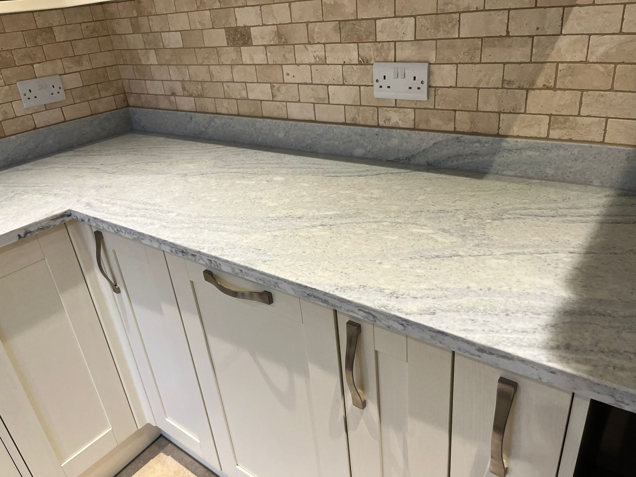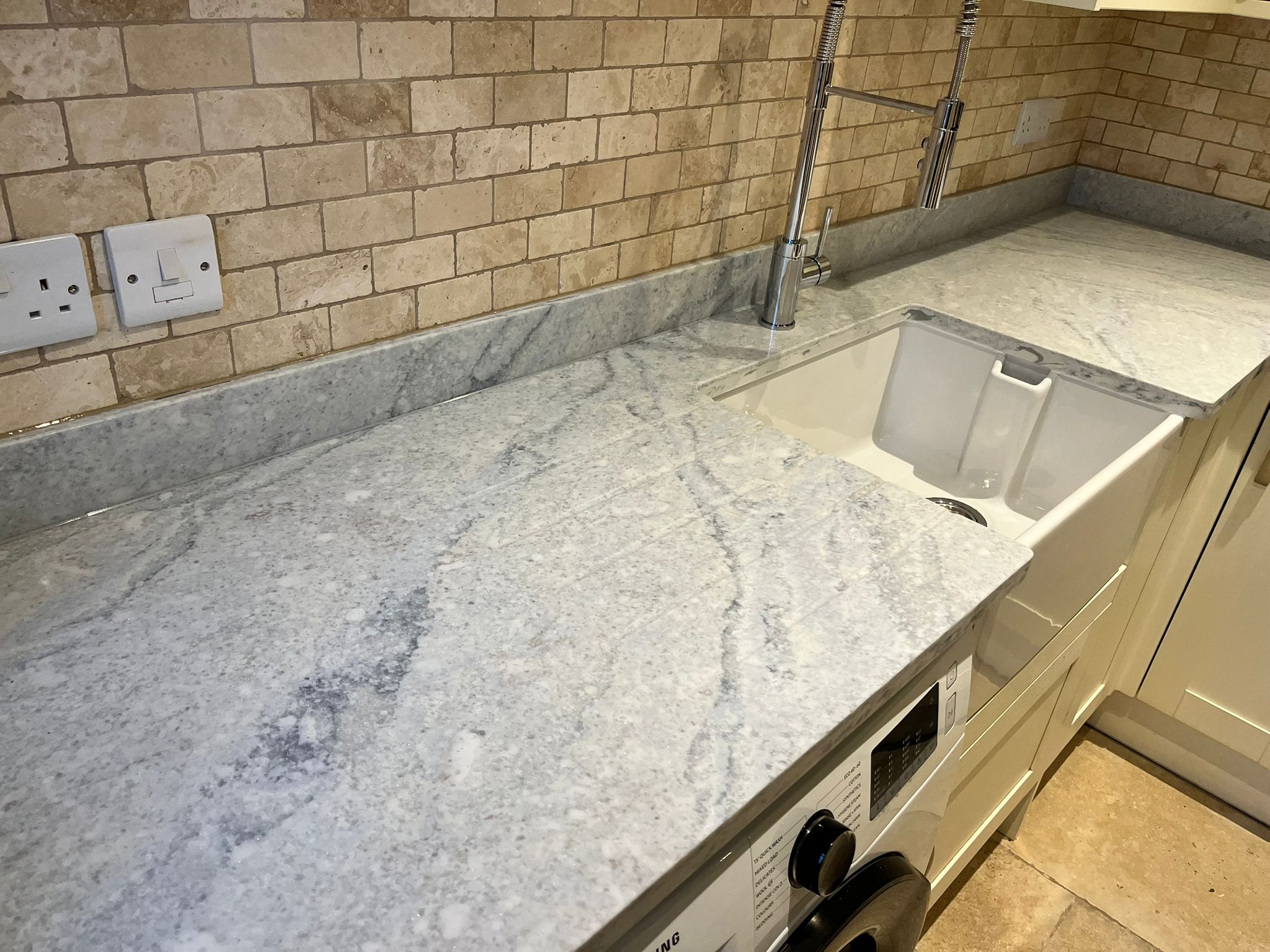 Pacific Blue- Pacific Blue Quartz features a serene blend of pale icy blues, crisp whites, and sweeping grey veining that brings a fresh, airy elegance to any interior. Its soft, fluid movement and light-reflecting tones create a sense of calm and spaciousness—perfect for brightening kitchen worktops, creating tranquil bathroom sanctuaries, and feature splashbacks that offer a subtle touch of coastal charm.