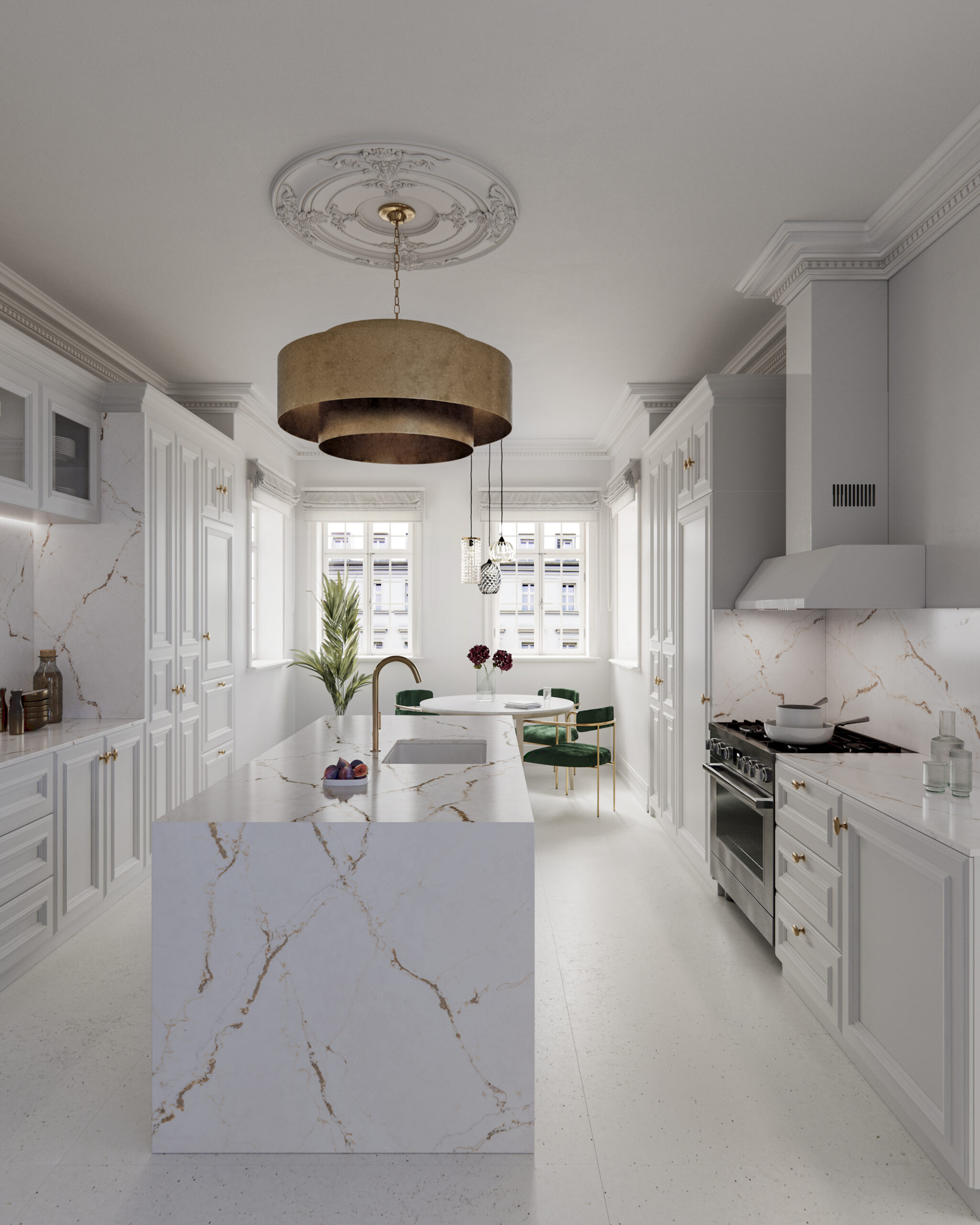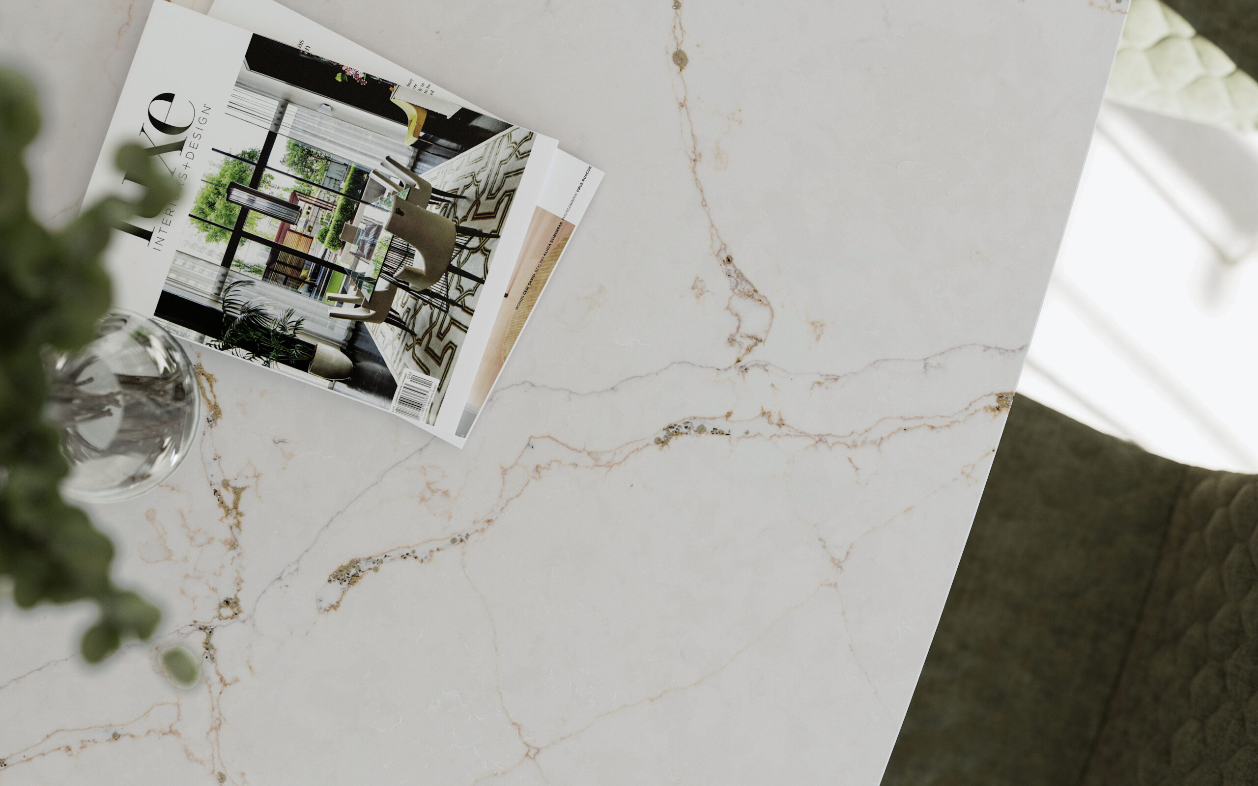 Enhance your kitchen with the elegant Silestone Versailles Ivory worktops. This luxurious quartz surface, features a warm ivory base with subtle two-toned marbling and shimmering golden veins. The intricate design evokes the opulence of the Palace of Versailles, adding a touch of sophistication to any space.