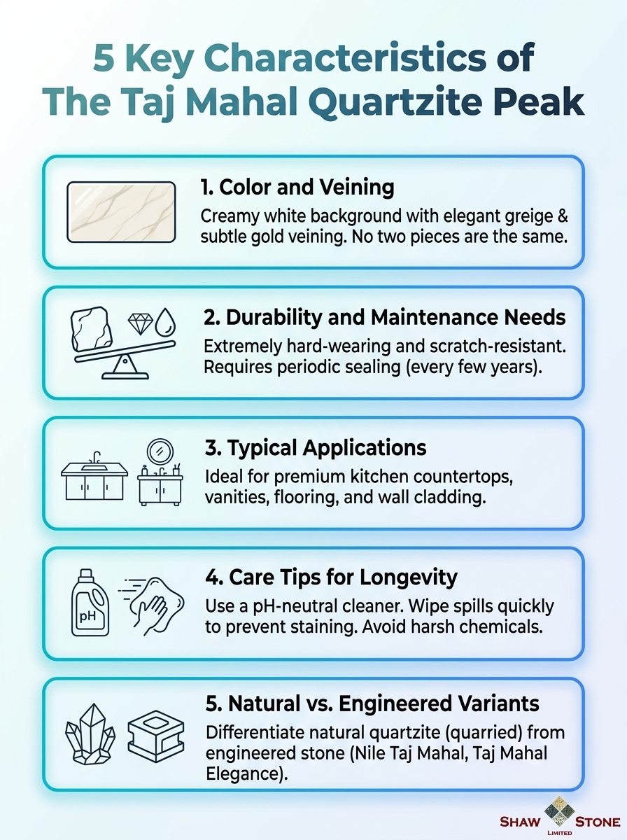 This infographic highlights the five key characteristics of The Taj Mahal Quartzite Peak, offering quick insights into its geology and appearance.